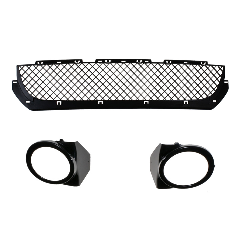 Komplett stötfångare där lister, luftintagsnät och ramar till dimljusen ingår.