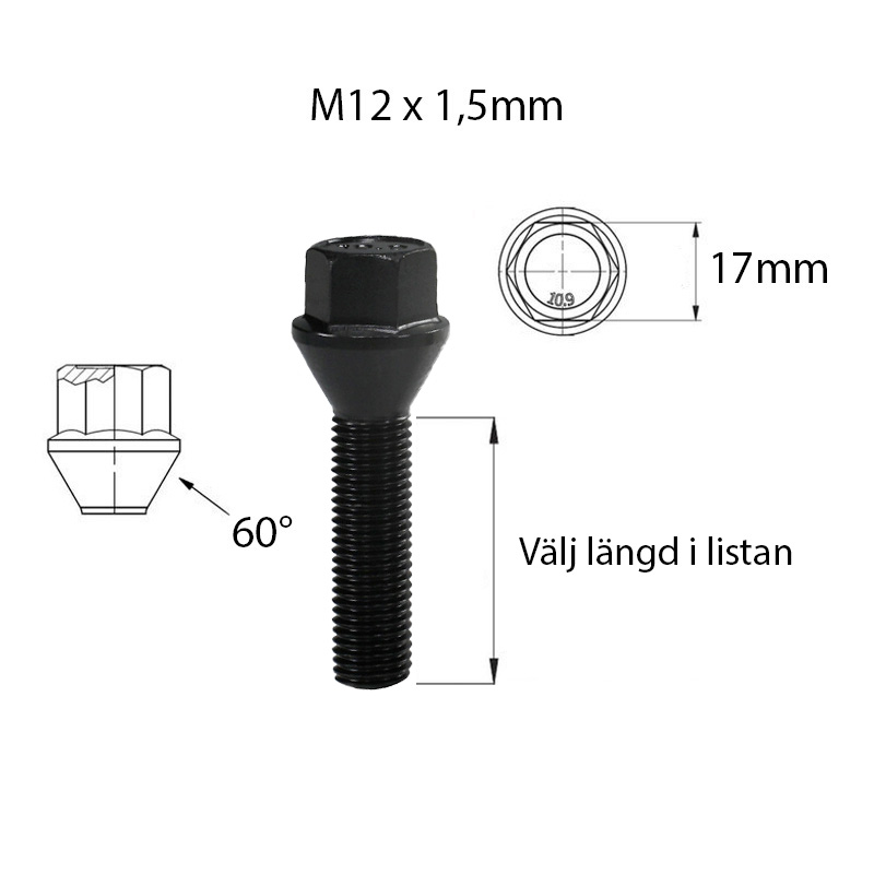 Standardlängd på en hjulbult är vanligtvis mellan 26 och 28mm men det finns undantag. Dubbelkolla alltid så fälg och däck löper fritt innan provkörning, då längden på hjulbultar kan skilja sig på enskilda bilmodeller samt fälgar.