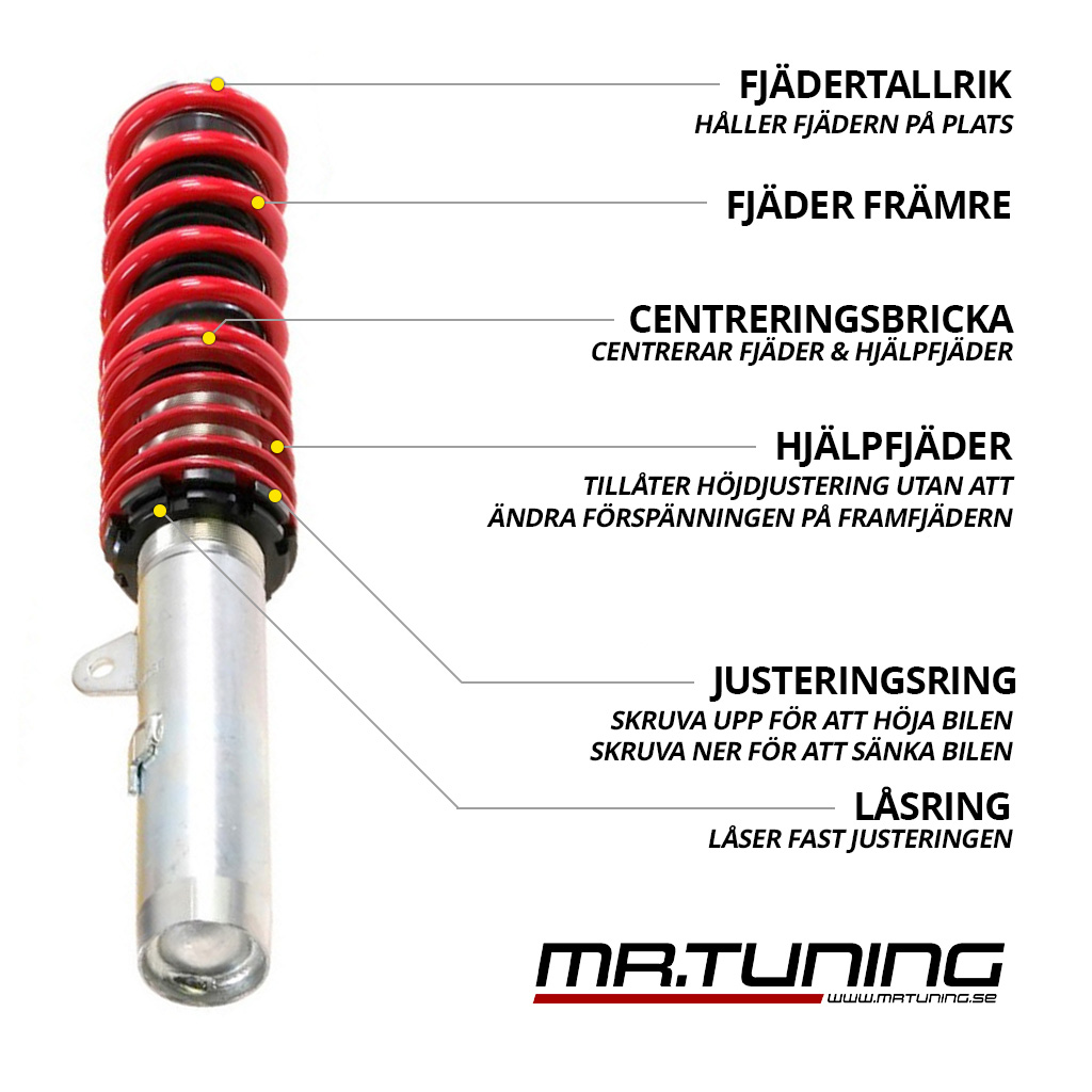 - Möjlighet till köp av separata delar av coiloversatsen (brukar endast finnas på dyrare coilovers)