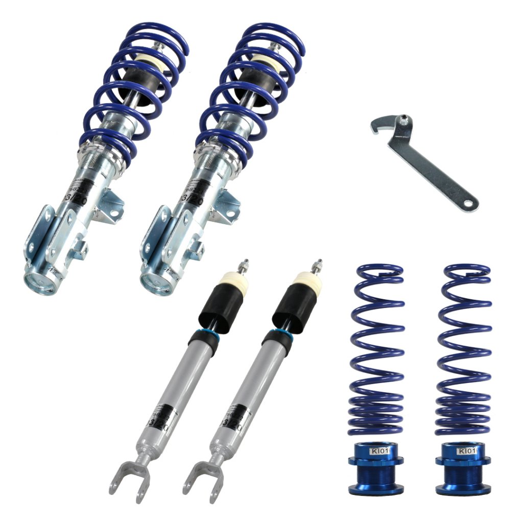 Mycket prisvärda coilovers med galvaniserade fjäderben och pulverlackerade fjädrar.
