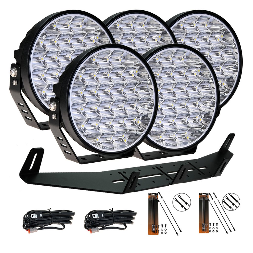 Levereras komplett med 5st extraljus, hållare, reläsats, DT kontakt, skarvstycke, rostfritt fäste, rostfria bultar och svensk manual.